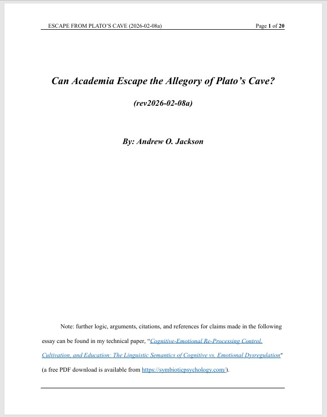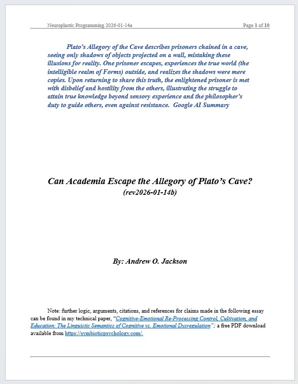 Our primary and secondary school teachers are indoctrinating their students (and future academics) with an geocentric psychology of emotionally driven behavior that sabotages our children’s natural cognitive-emotional re-processing mechanisms that have evolved to guide one’s own cognitive behavior (such as thoughts, imaginings, reasoning, etc.) towards health, well-being and successful and effective decision-making and their actualization Reference: Jackson, A.O. (2026). (Technical Paper with Supplements.) Cognitive-Emotional Re-Processing Control, Cultivation, and Education: The Linguistic Semantics of Cognitive vs. Emotional Dysregulation. Symbiotic Psychology Press. (15,500-word paper, free PDF download, new tab)