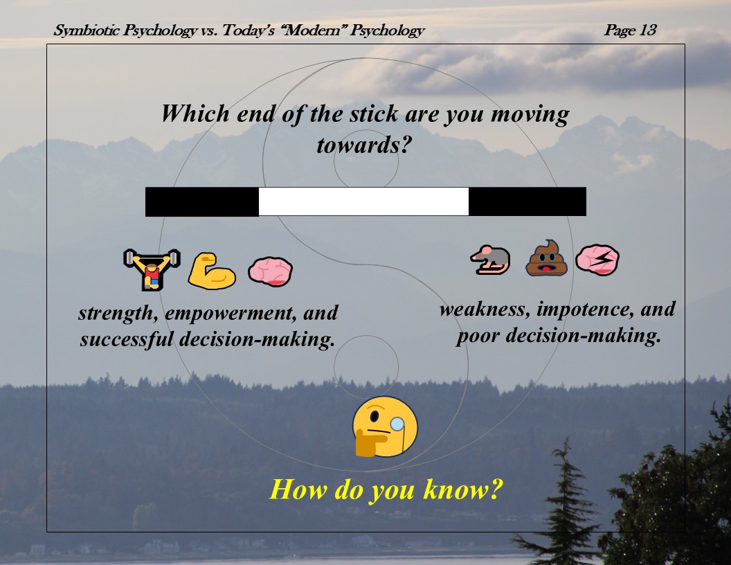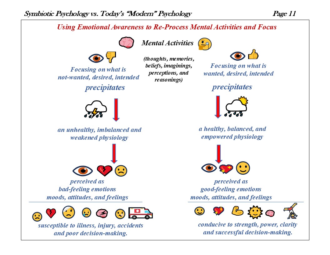 I developed my own therapy. I used my emotions to guide my cognitive activities to find a better feeling, or less bad-feeling cognitive activity (thought, memory, belief, imagining, perception, reasoning, discernment). My premise was that the better feeling emotions, moods, attitudes and feelings correlated with a healthier biochemical “balance”, and bad feeling emotions, moods, attitudes, and feelings correlated with an unhealthy, biochemical imbalance.