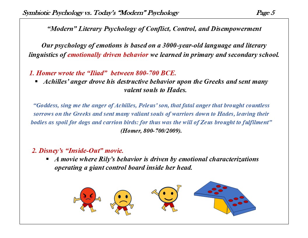 Is the psychological “science” of emotional regulation, control, and management (that is, “emotions drive behavior” and therefore “dangerous emotions can drive destructive behavior”) based in logic and research? Or are these paradigms of beliefs of “emotionally driven behavior” but an unquestioned and accepted neurolinguistic programing of Homer’s literary linguistics inscribed in his “Iliad” nearly 3000-years-ago? The theory of “emotional dysfunction and disorder” may have a successful scope of understanding… like a flat Earth road map is successful. But, if circumnavigating the globe, flat Earth technology is useless. An investigation into the limiting “science” of literary defined emotionally driven behavior is in order.