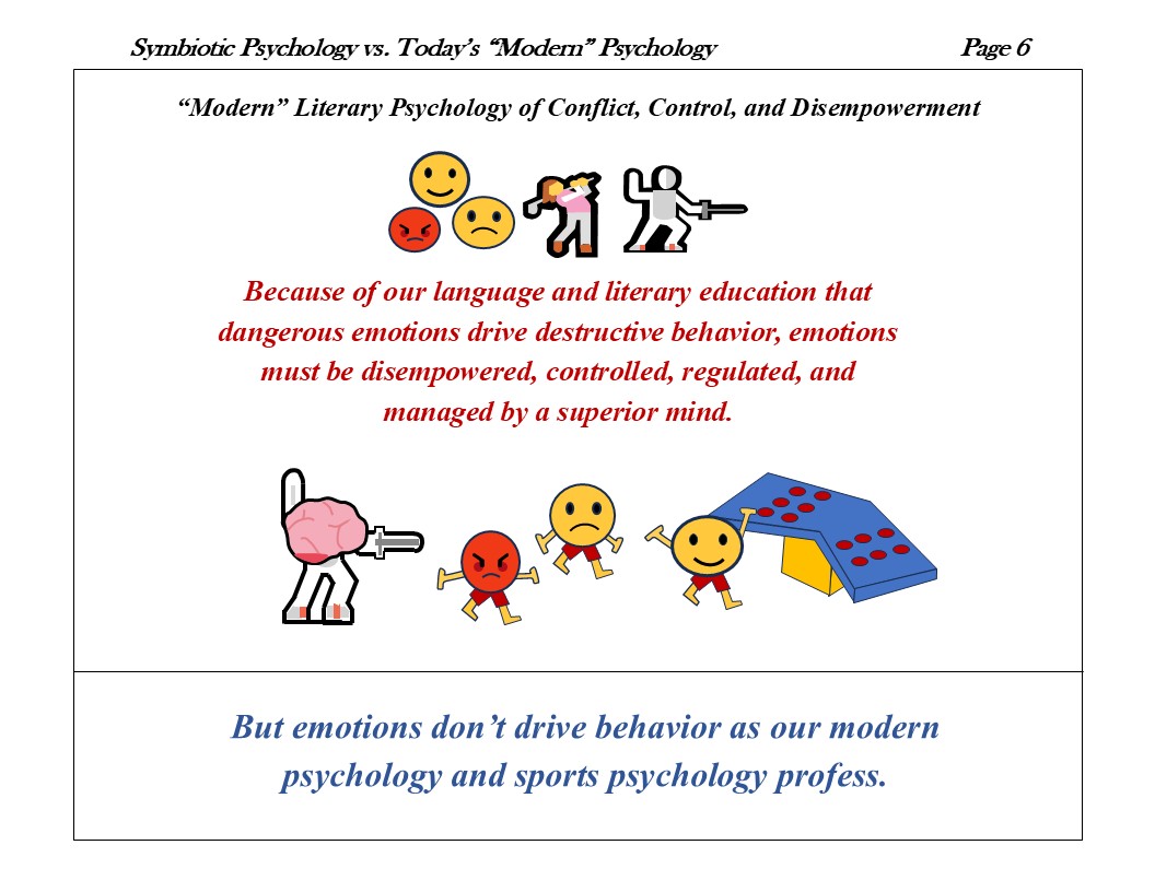 Today”s “modern” sports psychology is based on a language and literary linguistics of “emotionally driven behavior” inscribed in Homer’s “Iliad” nearly a 3000-year-ago. Ever since Achilles’ fatal rage brought countless sorrows upon the Greeks, aberrant and dangerous emotions that drive destructive behavior must be controlled by the “superior” cognitive mind through physical and mental “toughness” training and conflict. Symbiotic Sports Psychology is based on the science of human physiology and understanding the principles of evolution, not the emotionally driven behavior and control linguistics founded in language, literature, religion. Scientifically, emotions don’t drive behavior, physiology drives behavior. Emotions are the perception of this physiology. It is aberrant and dangerous mental activities (such as thoughts, memories, beliefs, imaginings, perceptions, and reasoning) that precipitate the changes and states of neurology, biochemistry, and physiology in the brain and body that drives behavior. It is the cognitive mind that must be controlled, regulated, and manged through emotional awareness. Good-feeling emotions have an evolved correlation with a strong, balanced, and robust physiology conducive to health, well-being, and successful decision-making. Bad-feeling emotions have an evolved correlation with a weak, impotent, and unhealthy physiology susceptible to illness, sickness, accidents, and poor decision-making. Developing the evolutionary harmony between a warrior’s mind, body, emotions, and awareness through a symbiotic psychology creates a physically stronger, faster, and more powerful warrior that is mentally more agile, cunning, and has a greater capacity for successful decision-making.