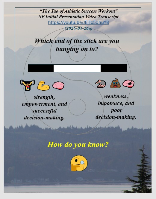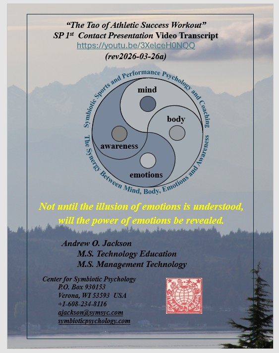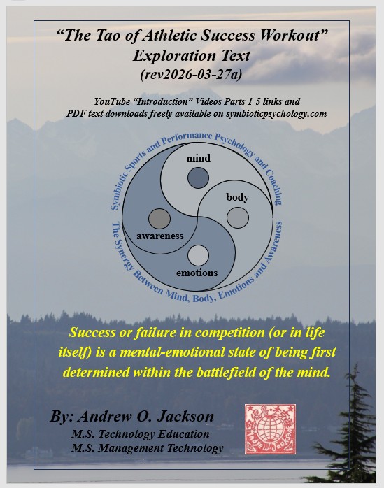 “The Tao of Athletic Success Workout” (immediately below) is a new sports performance psychology based on millions of years of evolutionary survival of the fittest, strongest, most agile and most powerful and clever and their evolved symbiotic harmony of mind, body, emotions, and awareness within a personal power of Qi. “The Tao of Athletic Success Workout” is a freely available self-directed 10-hour program with “Introduction” Videos for hours 1-5 available on YouTube. Hours 6-10 are a freely available instructional, fill-in-the-blank “Exploration” text that further develops an athlete’s skills, abilities, and understandings of their “Quantum Being” nature beyond their Newtonian linear time and 3D spacial awareness, strengths, and power.