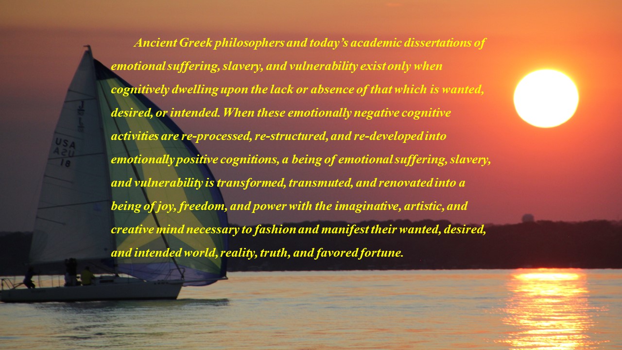 Ancient Greek philosophers and today’s academic dissertations of emotional suffering, slavery, and vulnerability exist only when cognitively dwelling upon the lack or absence of that which is wanted, desired, or intended. When these emotionally negative cognitive activities are re-processed, re-structured, and re-developed into emotionally positive cognitions, a being of emotional suffering, slavery, and vulnerability is transformed, transmuted, and renovated into a being of joy, freedom, and power with the imaginative, artistic, and creative mind necessary to fashion and manifest their wanted, desired, and intended world, reality, truth, and favored fortune.